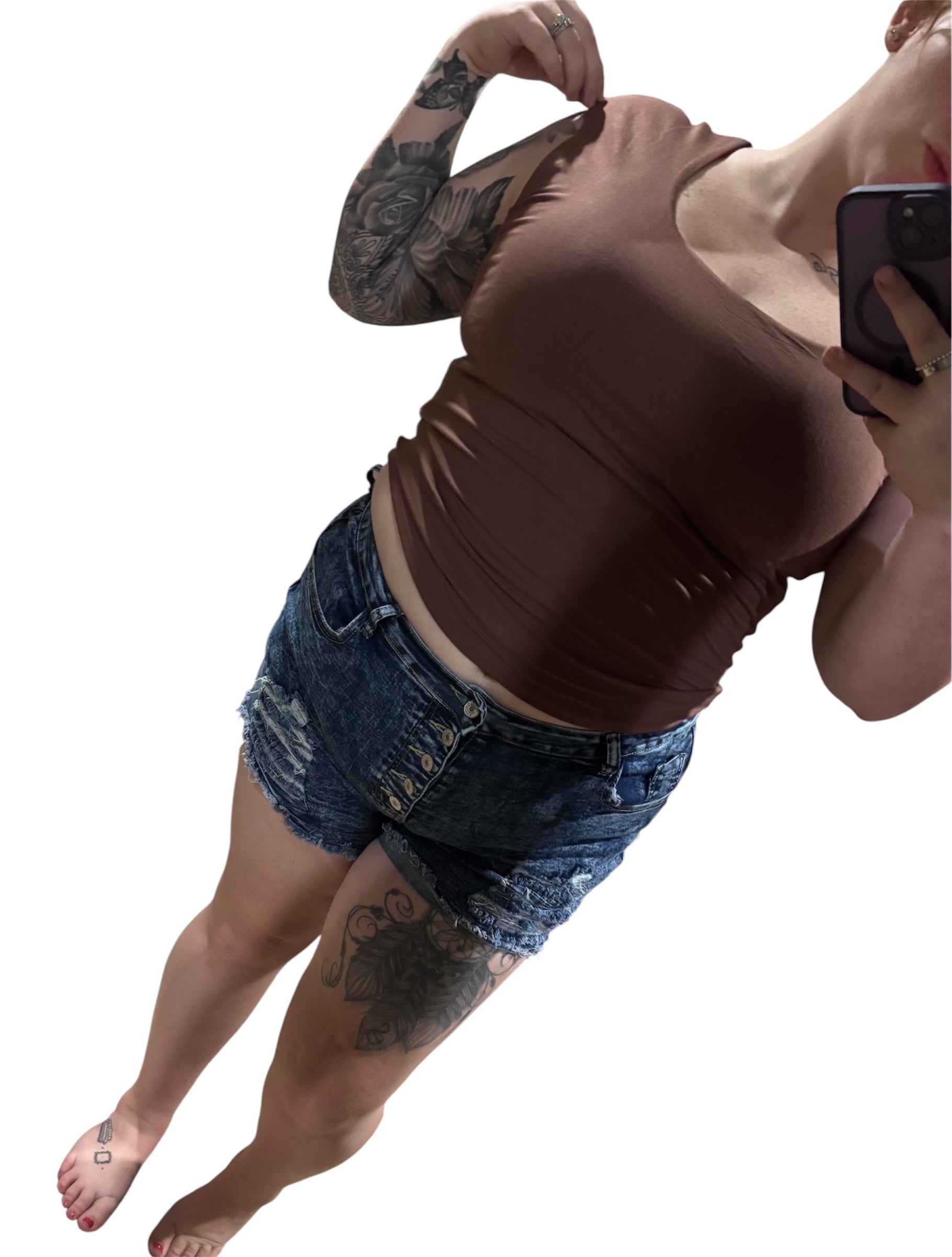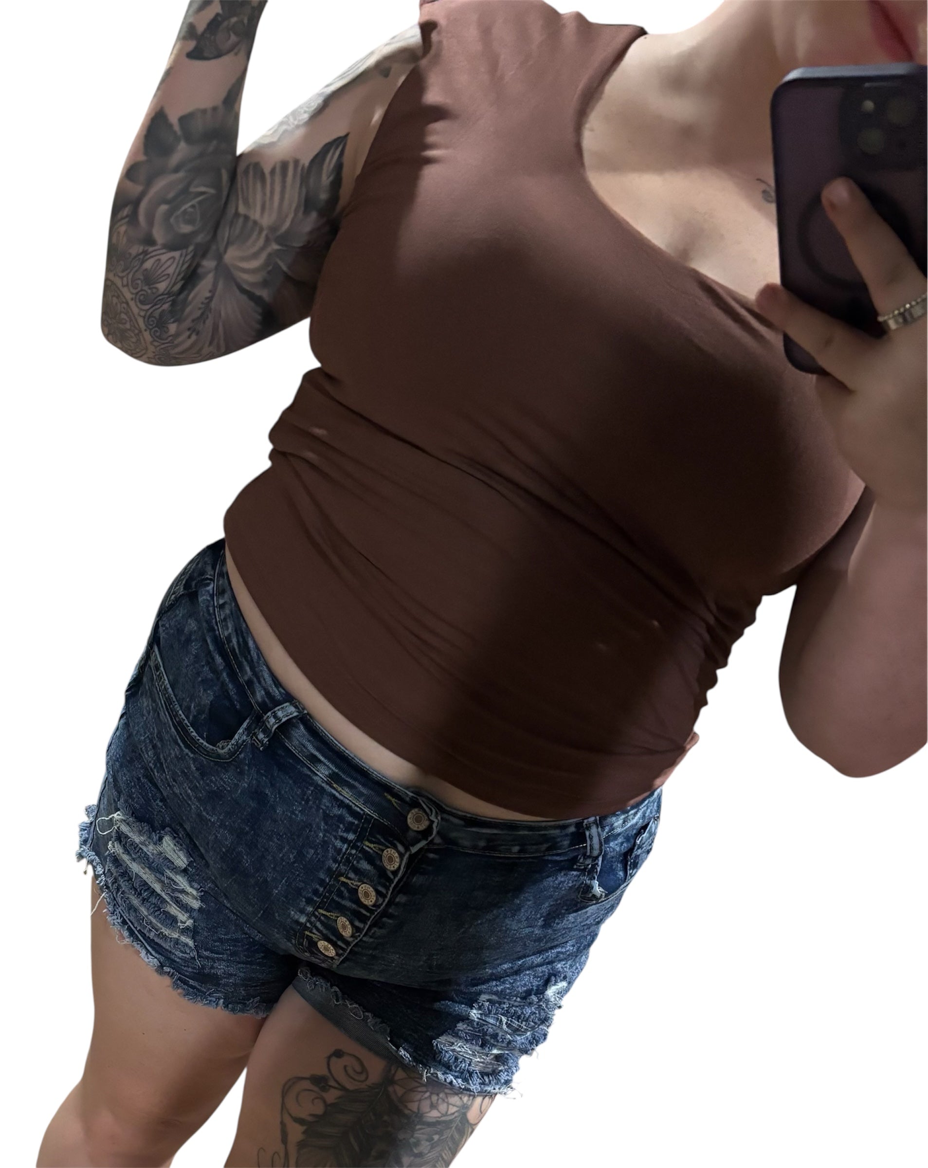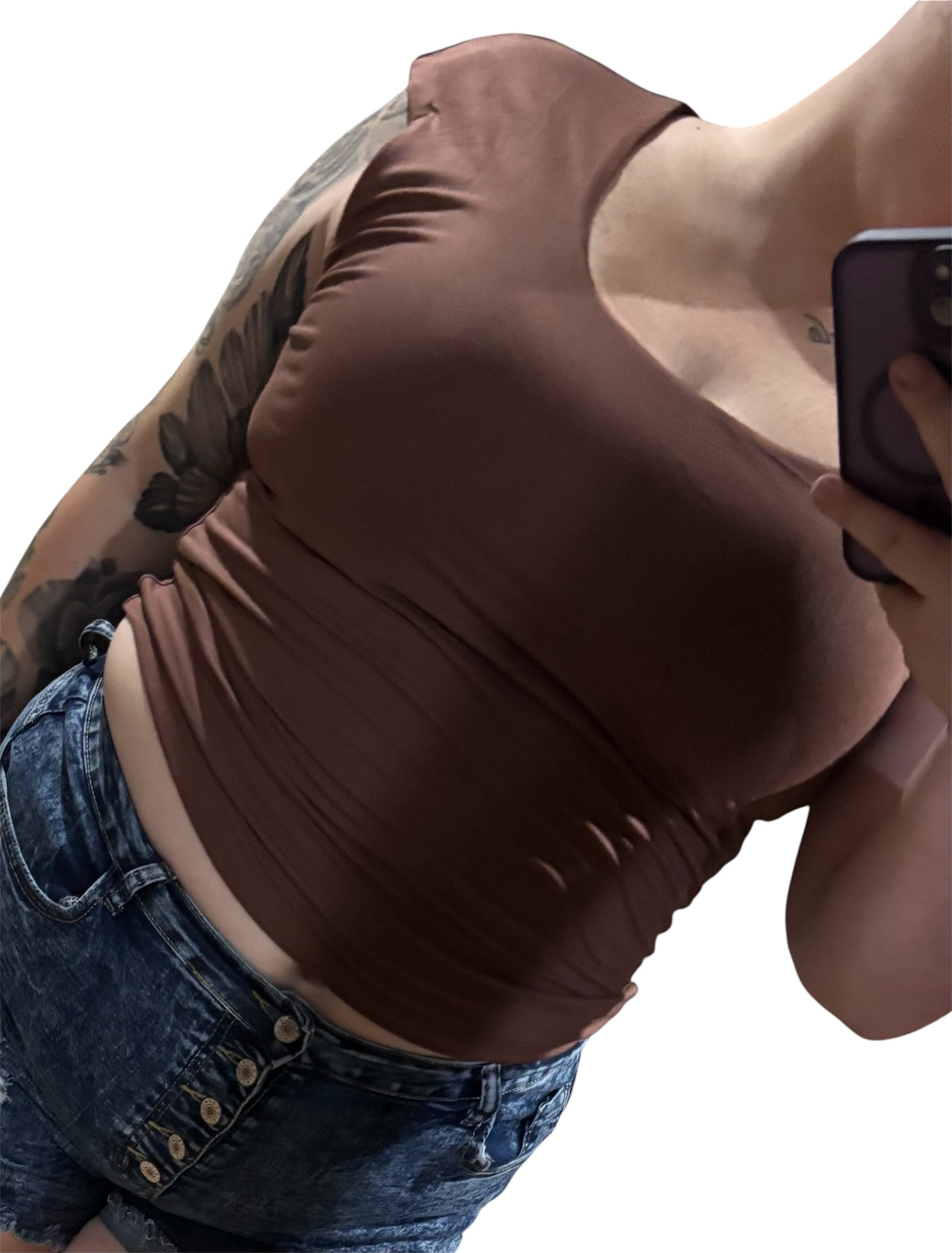 Solid coffee brown sleeveless tee, U Neckline. Fun and casual – a basic that is a staple piece in your closet!